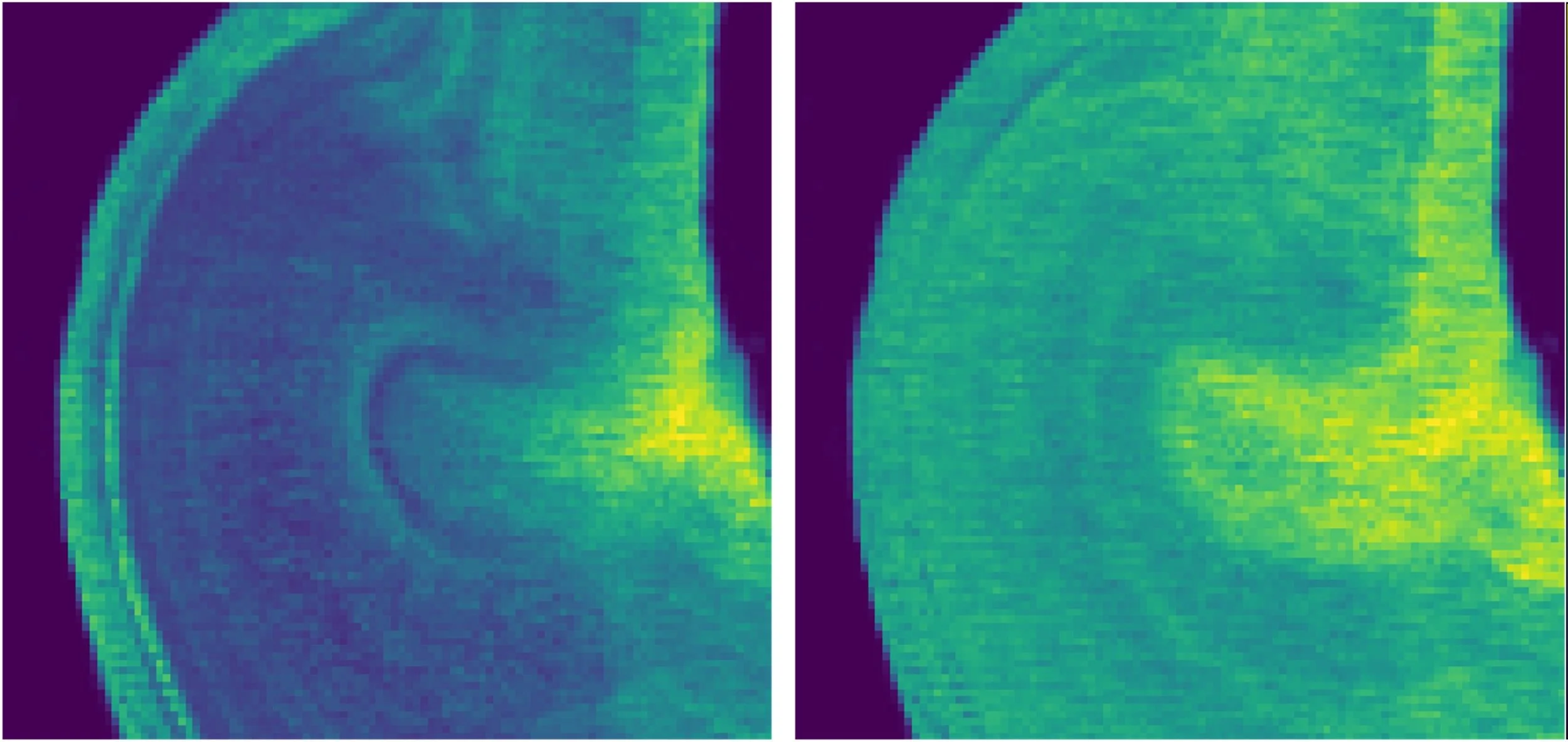 Chemical maps of gastric ossicles dissected from crabs. Left: shows a map of phosphorus concentrations; right: shows a map of strontium concentrations. These chemical maps tell a story about the ecology and movement of crabs. Maps produced by Kaitlyn Rowney©.